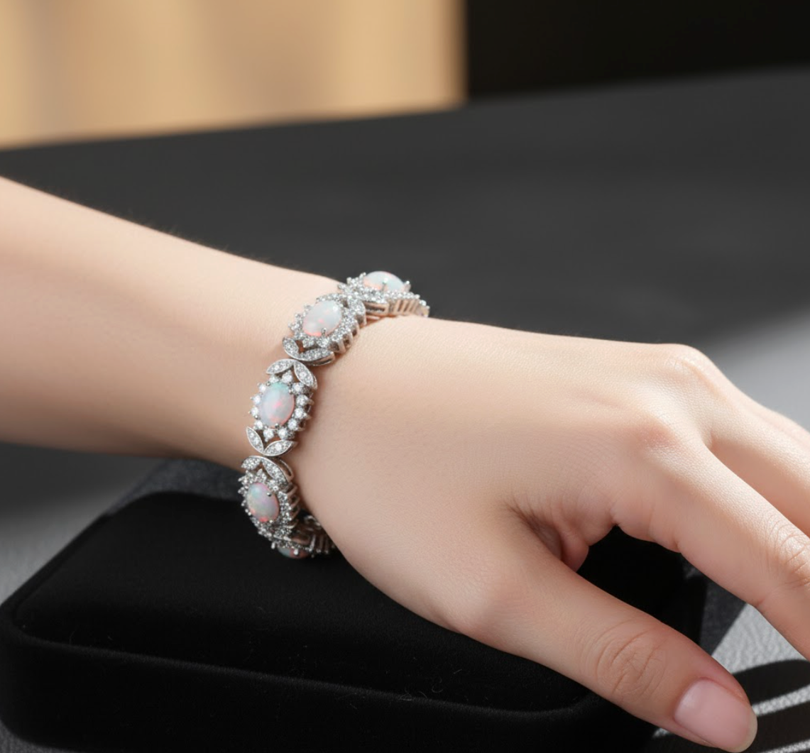 The Opaline Veil layers zircon brilliance with opalescent fire, a bracelet where shifting light reveals hidden depths. With leaf-like forms that evoke quiet grace, it wraps the wrist in an elegance that feels both natural and eternal.